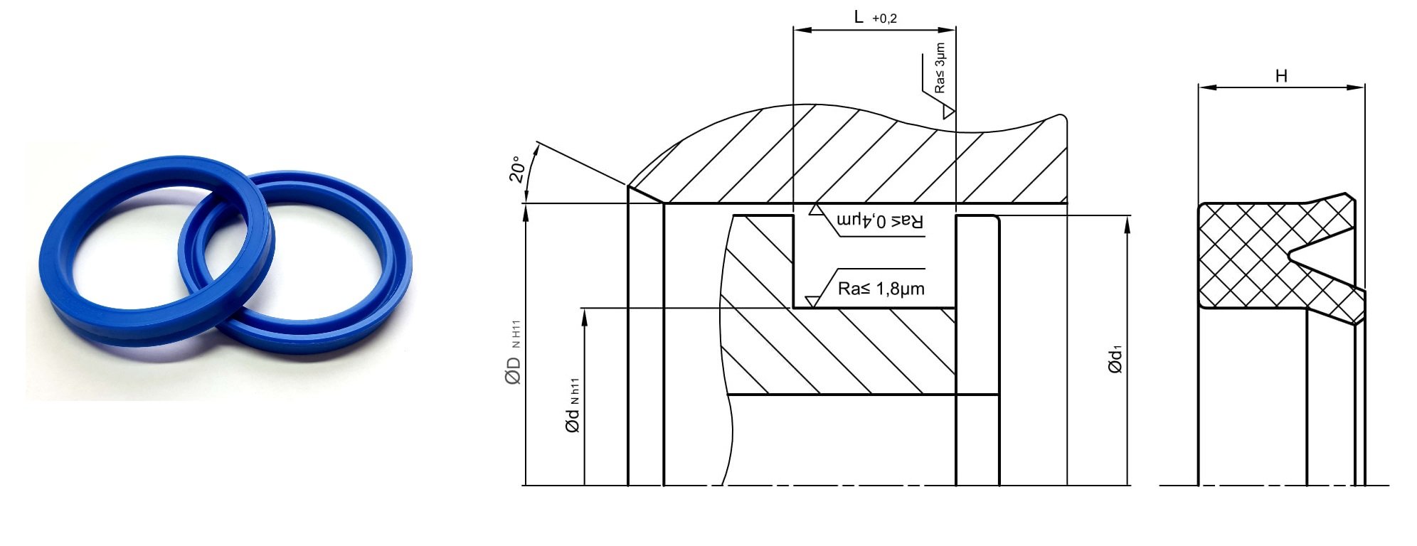Okraj vnějšího průměru je navržen tak, aby těsnil proti otvoru válce, zatímco okraj vnitřního průměru je určen pro utěsnění průchodky. U většiny nesymetrických profilů pístů je velikost těsnění o něco menší než průměr průchodky. Po instalaci se těsnění natáhne do průchodky, aby se zajistilo těsné utěsnění žlábku a zlepšila se stabilita při aplikaci.